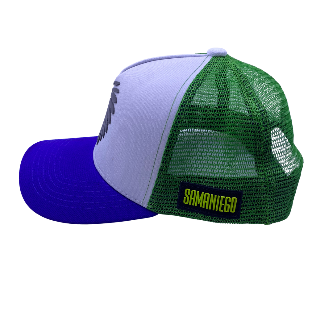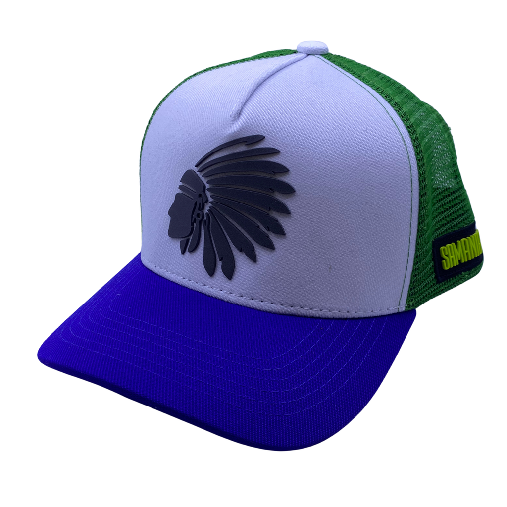 O Boné Samaniego Urban Jungle chega com uma combinação de cores ousada e cheia de personalidade: frente branca clean, aba azul intensa e traseira em verde vibrante. Um visual urbano que destaca quem não tem medo de ser diferente.