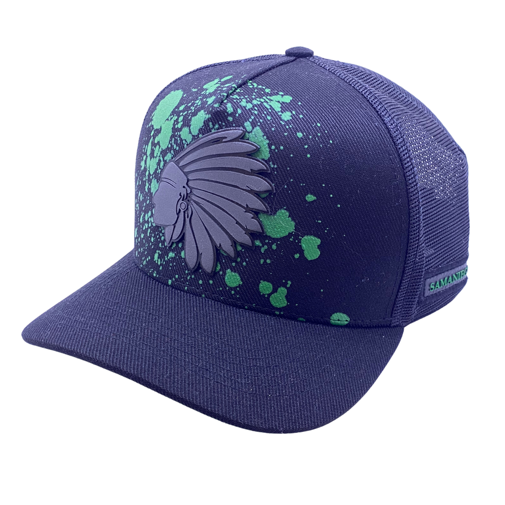 O Boné Samaniego Urban Splash foi feito pra quem gosta de se destacar com estilo único e ousado. O navy profundo combinado com respingos de tinta verde traz uma estética artística e cheia de personalidade — ideal pra quem curte moda street e não dispensa originalidade no fit.